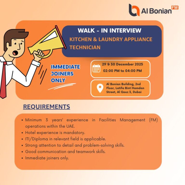 A walk-in interview is a direct hiring process where candidates meet the employer without prior appointments and get evaluated immediately. The Al Bonian FM walk-in interview in Dubai is a current UAE walk-in interview focused on hiring experienced Kitchen & Laundry Appliance Technicians for immediate joining in facilities management operations.